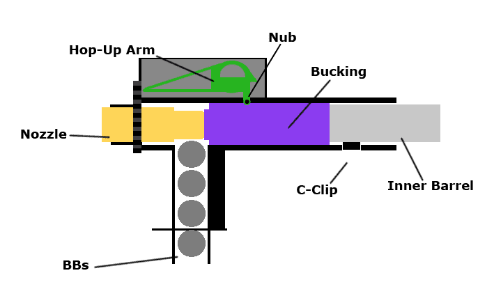 - Hop Up Nub: Den lilla delen som trycker på gummit för att skapa bakspin.