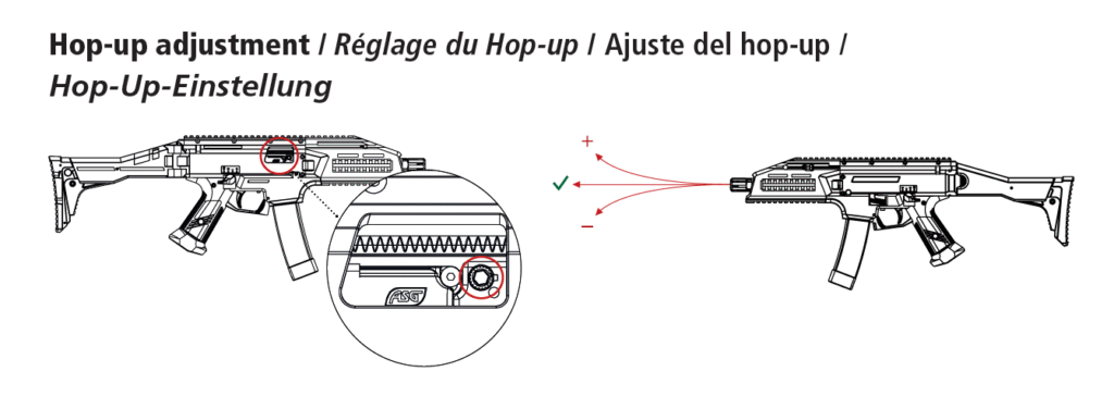- Hop Up Arm: Trycker ner nuben för att justera hur mycket backspin kulan får.